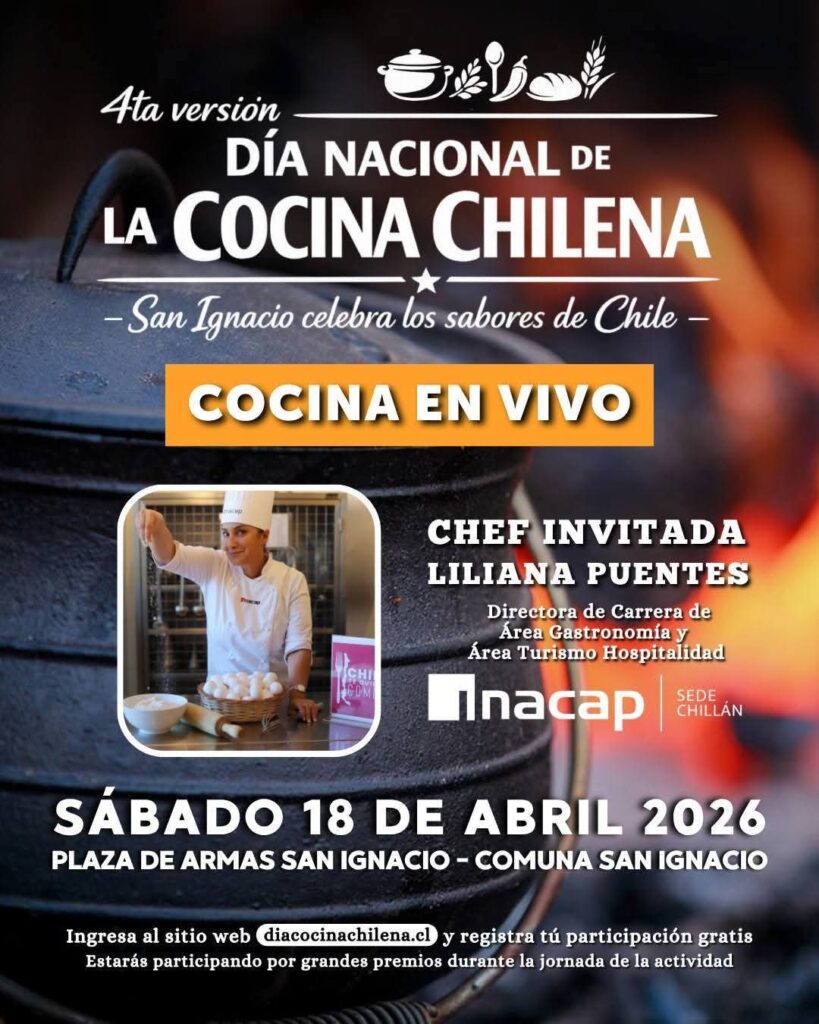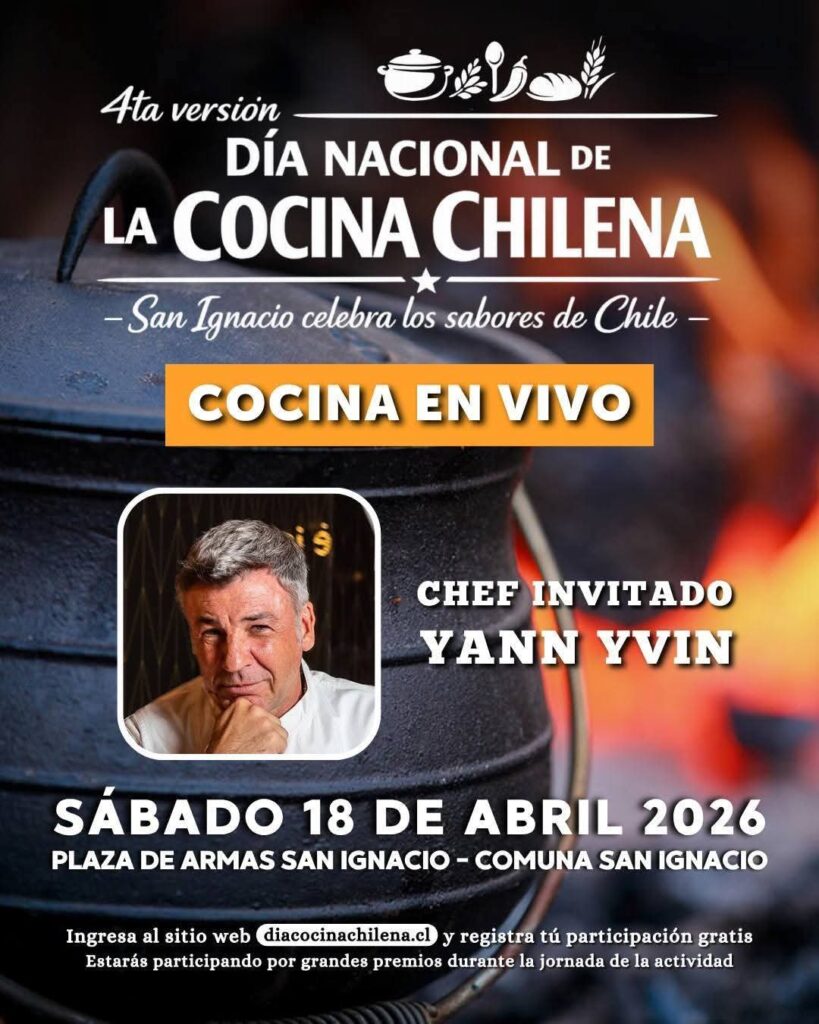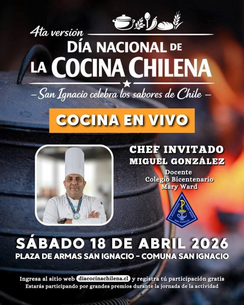 El próximo sábado 18 de abril de 2026, la Plaza de Armas de San Ignacio será el escenario de la 4ª versión del Día Nacional de la Cocina Chilena. La jornada contará con demostraciones de cocina en vivo a cargo de reconocidos chefs como Yann Yvin, Miguel González y Liliana Puentes, quienes compartirán su talento y pasión por los sabores tradicionales del país.