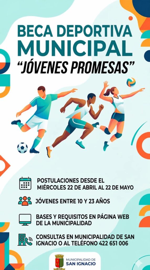 La Ilustre Municipalidad de San Ignacio abrió las postulaciones para la Beca Deportiva Municipal 2026 “Jóvenes Promesas”, iniciativa que busca apoyar y potenciar el talento de jóvenes deportistas locales.