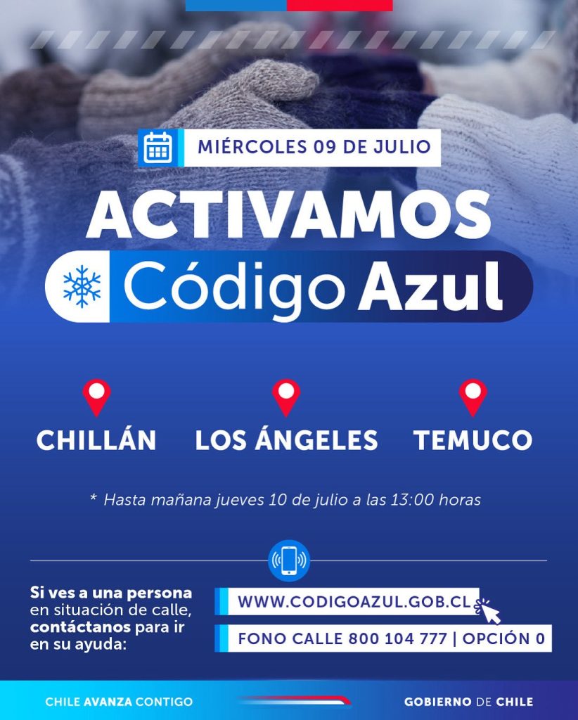 Desde hoy miércoles 9 de julio a las 17:00 horas hasta mañana jueves 10 a las 13:00 horas, rige el Código Azul en las comunas de Chillán, Los Ángeles y Temuco debido a las bajas temperaturas.
