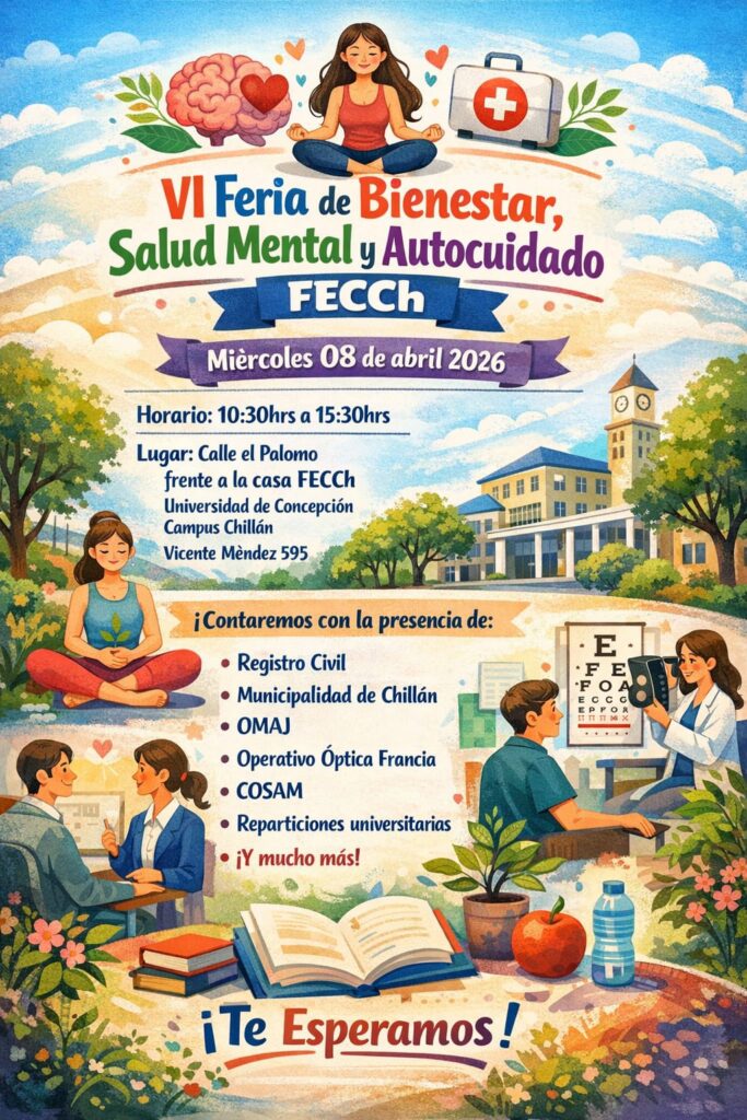 La Universidad de Concepción, Campus Chillán, fue escenario de la VI Feria de Bienestar, Salud Mental y Autocuidado, organizada por FECCh el miércoles 8 de abril. La jornada reunió a instituciones públicas, reparticiones universitarias y organizaciones locales en torno a la promoción de la salud integral.