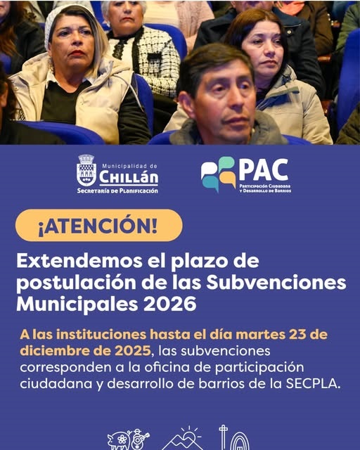 La Municipalidad de Chillán informa que se ha extendido el plazo de postulación a las Subvenciones Municipales 2026. Las instituciones habilitadas podrán presentar sus proyectos hasta el martes 23 de diciembre. Estas subvenciones, gestionadas por la Oficina de Participación Ciudadana y Desarrollo de Barrios de la SECPLA, buscan financiar iniciativas de desarrollo comunitario.
