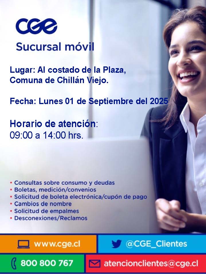 ¡Atención, Chillán Viejo! Este lunes 01 de septiembre, tendremos una *sucursal móvil de CGE* a un costado de la Plaza Mayor Isabel Riquelme. La comunidad podrá acercarse para realizar consultas y gestiones relacionadas con el servicio eléctrico.