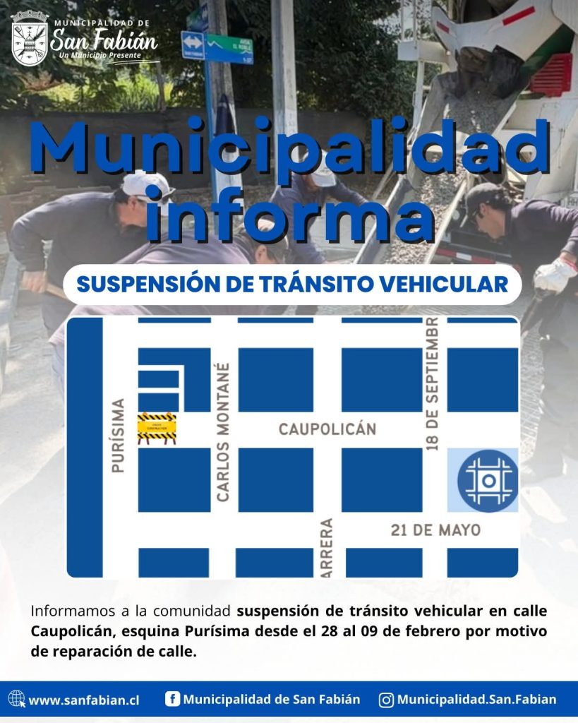 La Municipalidad de San Fabián informó la suspensión del tránsito vehicular en la intersección de las calles Caupolicán y Purísima desde el 28 de enero hasta el 9 de febrero.