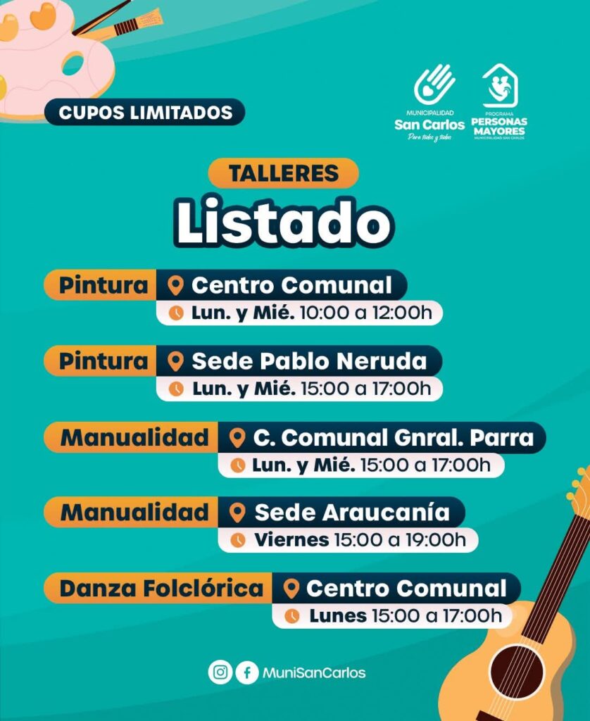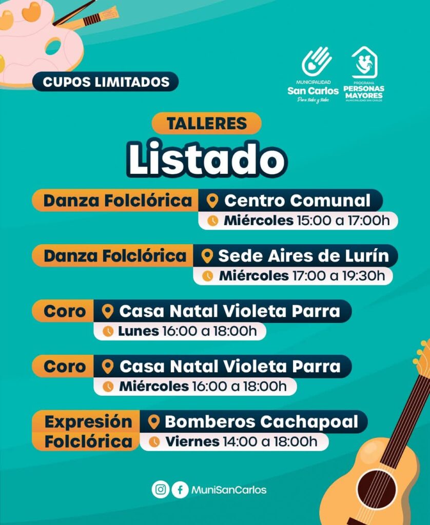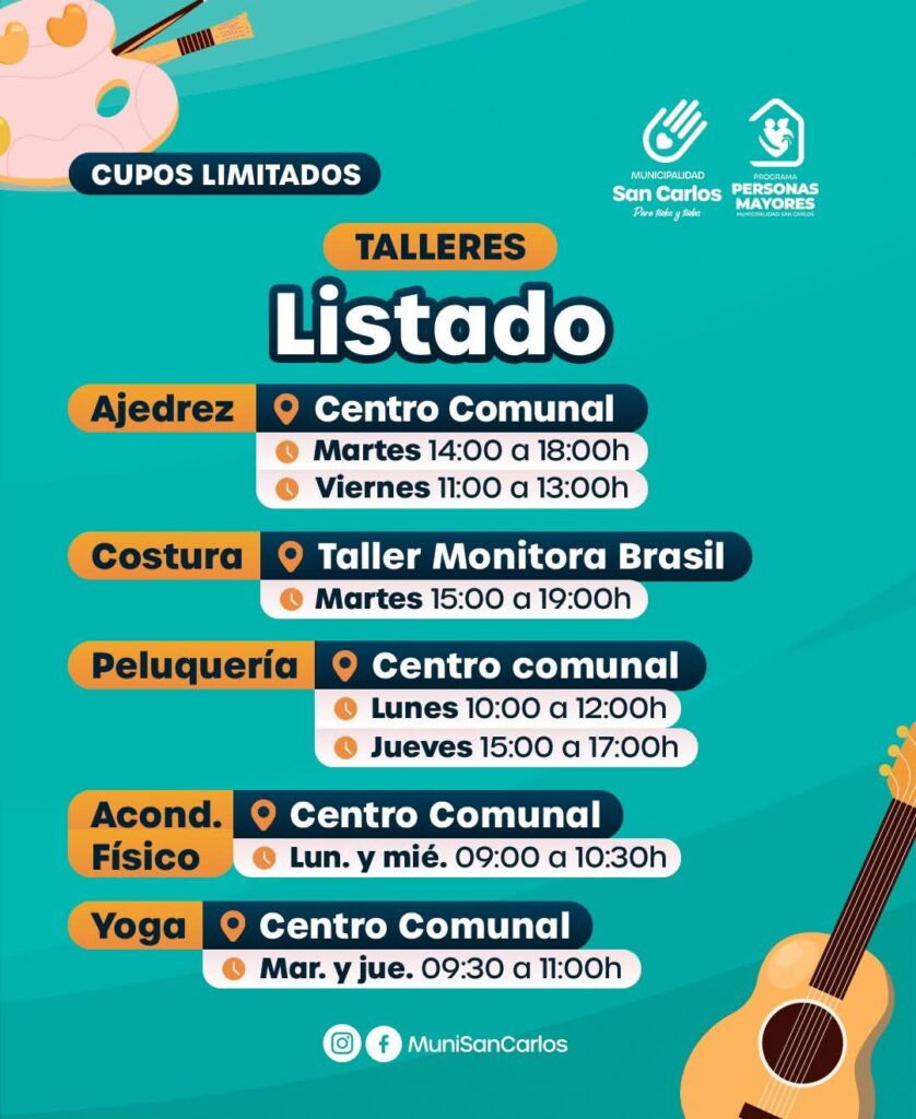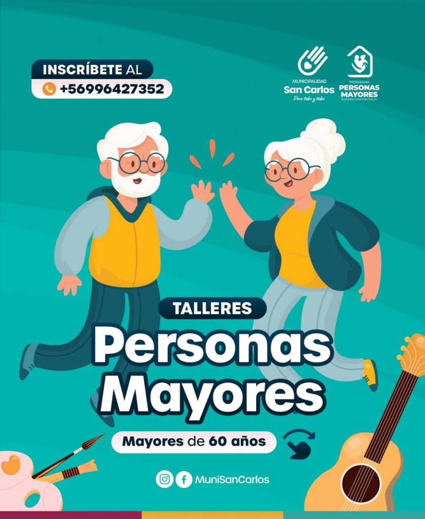 La Municipalidad de San Carlos, a través de su Programa Personas Mayores, abrió la inscripción para una variada oferta de talleres dirigidos a adultos mayores de 60 años. Pintura, manualidades, danza folclórica, coro, guitarra, yoga y acondicionamiento físico son algunas de las actividades disponibles en distintos centros comunitarios y sedes barriales.