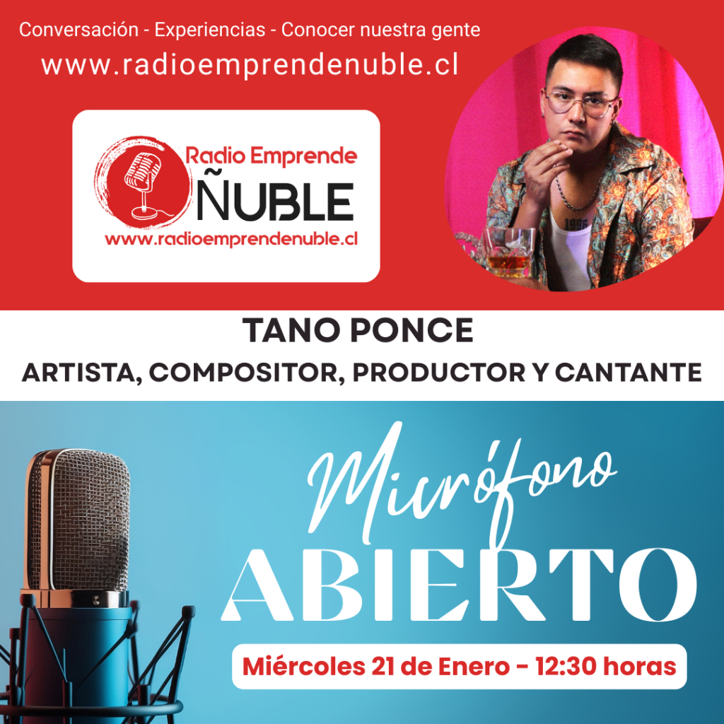 Este miércoles 21 de enero a las 12:30 horas, el reconocido artista, compositor, productor y cantante Tano Ponce será el protagonista del programa “Micrófono Abierto” en Radio Emprende Ñuble. En una conversación íntima y cercana, compartirá sus experiencias, inspiraciones y el camino que lo ha llevado a consolidarse en la escena musical.