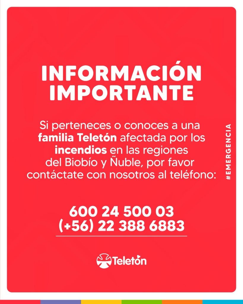 La Teletón informó que las familias y cuidadores de niños, niñas y jóvenes que reciben atención en sus centros y que se han visto afectados por los incendios en las regiones de Biobío y Ñuble pueden comunicarse al 📞600 24 500 03 o al +56 22 388 6883 para recibir orientación y apoyo.