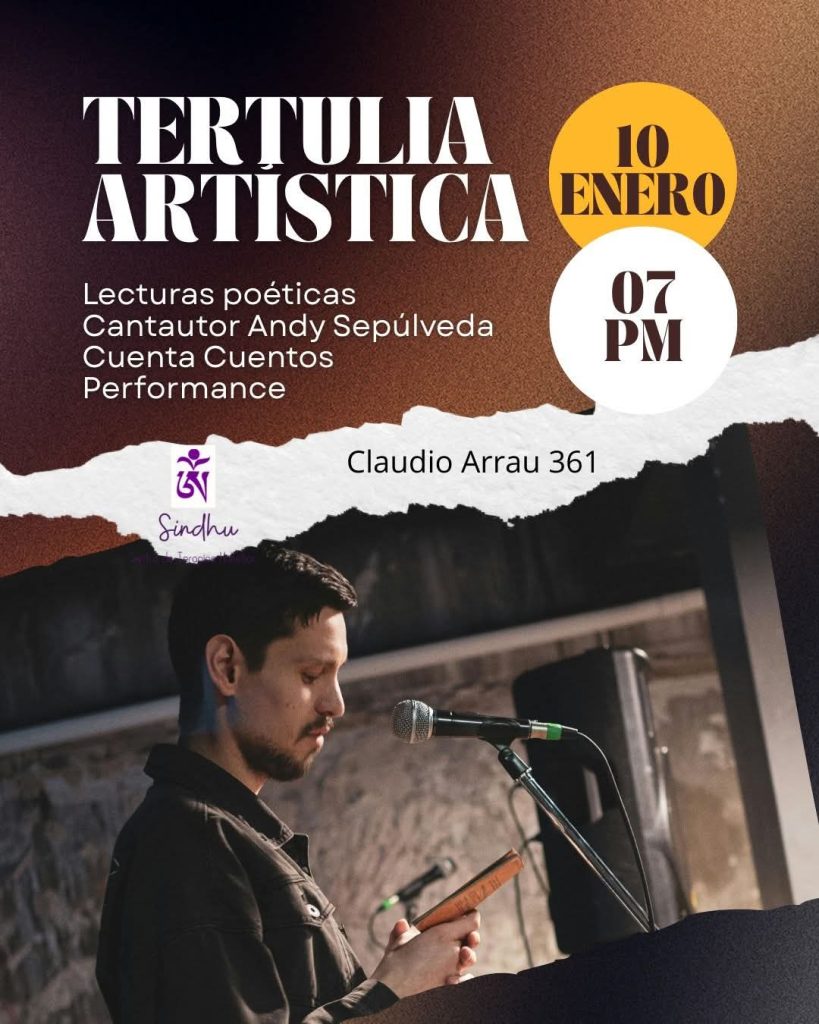 El próximo sábado 10 de enero a las 19:00 horas, el espacio Sindhu (Claudio Arrau 361, Chillán) recibirá una nueva Tertulia Artística. La velada reunirá lecturas poéticas, narraciones orales, performances y la música del cantautor Andy Sepúlveda.