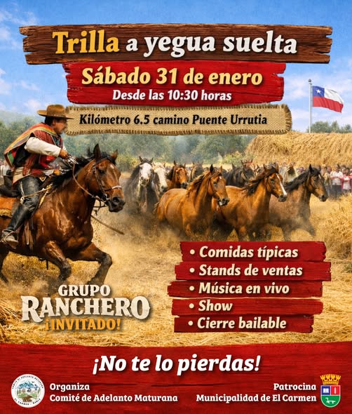 Este sábado 31 de enero, desde las 10:30 horas en el kilómetro 6.5 del camino a Puente Urrutia, se vivirá una jornada llena de tradición con la esperada Trilla a yegua suelta. El evento, organizado por el Comité de Adelanto Maturana y patrocinado por la Municipalidad de El Carmen, contará con comidas típicas, música en vivo, stands de venta, show artístico y un cierre bailable. Además, se presentará un grupo ranchero invitado para animar la celebración. ¡Una cita imperdible para toda la comunidad!