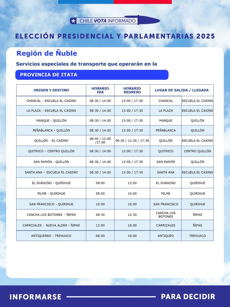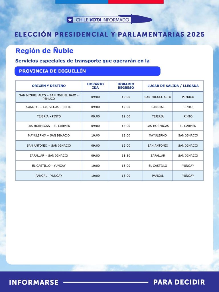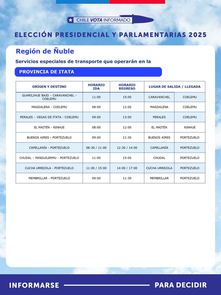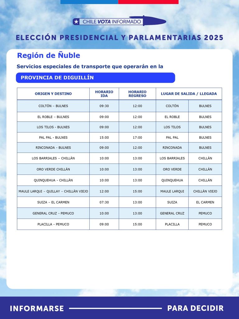 En este nuevo proceso electoral se beneficiará con un total de 82 servicios especiales en sectores rurales de la región: 30 en la provincia de Diguillín, 36 en la provincia de Itata y 16 en la provincia de Punilla, que se suman a los 15 servicios de transporte de Zonas Rurales y Aisladas.