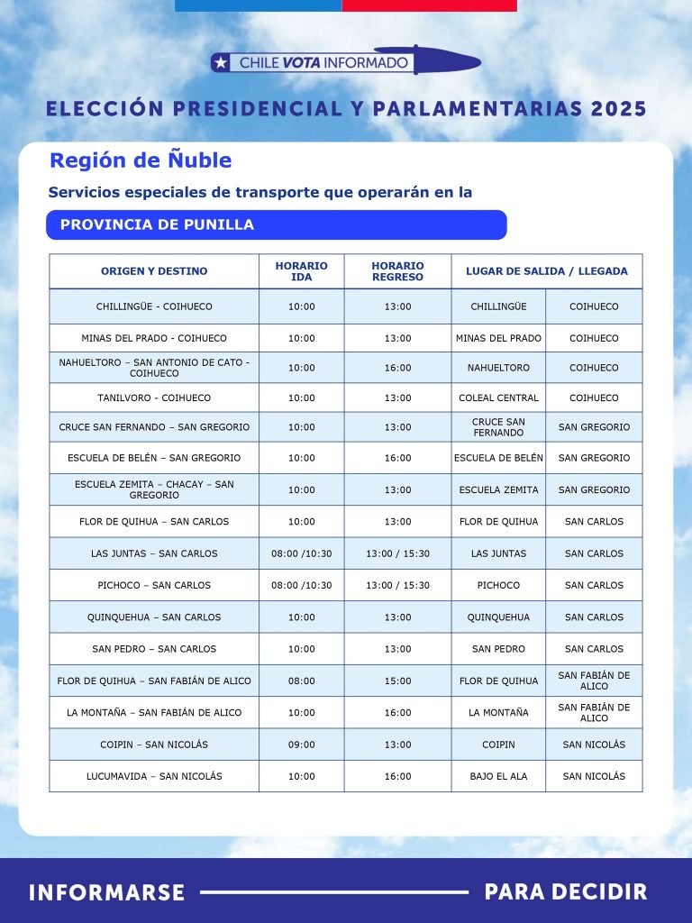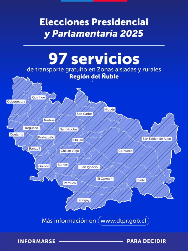97 servicios de transporte gratuito en Zonas aisladas y rurales se dispondrán para las elecciones presidenciales y parlamentarias del 16 de noviembre en #Ñuble, con los que buscamos que la ciudadanía pueda acceder de manera oportuna a sus lugares de votación.