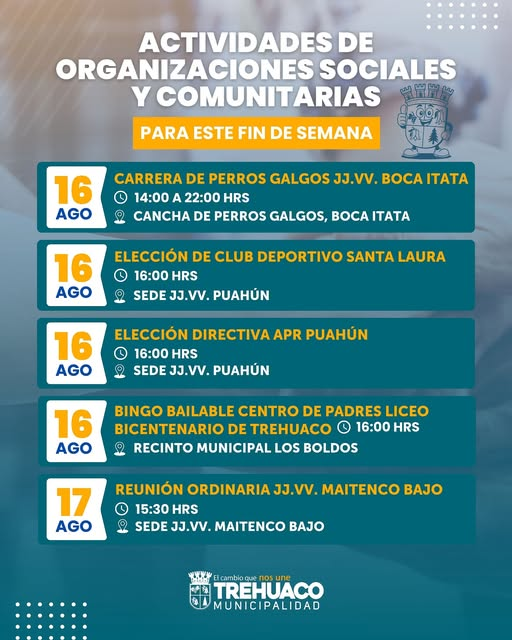 Este 16 y 17 de agosto, el Municipio de Trehuaco se llena de vida con una variada agenda de eventos sociales y comunitarios. Desde la emocionante carrera de perros galgos en Boca Itata hasta el bingo bailable del Centro de Padres del Liceo Bicentenario, pasando por elecciones vecinales y reuniones organizativas, los vecinos podrán disfrutar y participar activamente en su comunidad.