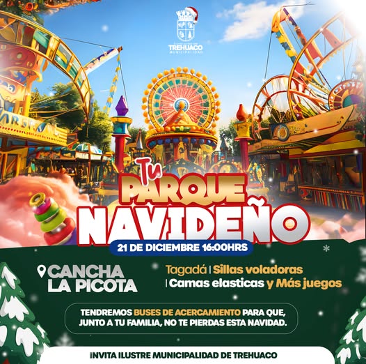 La Ilustre Municipalidad de Trehuaco invita a todas las familias a disfrutar de “Tu Parque Navideño”, una jornada llena de alegría y juegos que se realizará el jueves 21 de diciembre a las 16:00 horas en la Cancha La Picota. El evento contará con entretenidas atracciones como Tagadá, sillas voladoras, camas elásticas y más sorpresas.