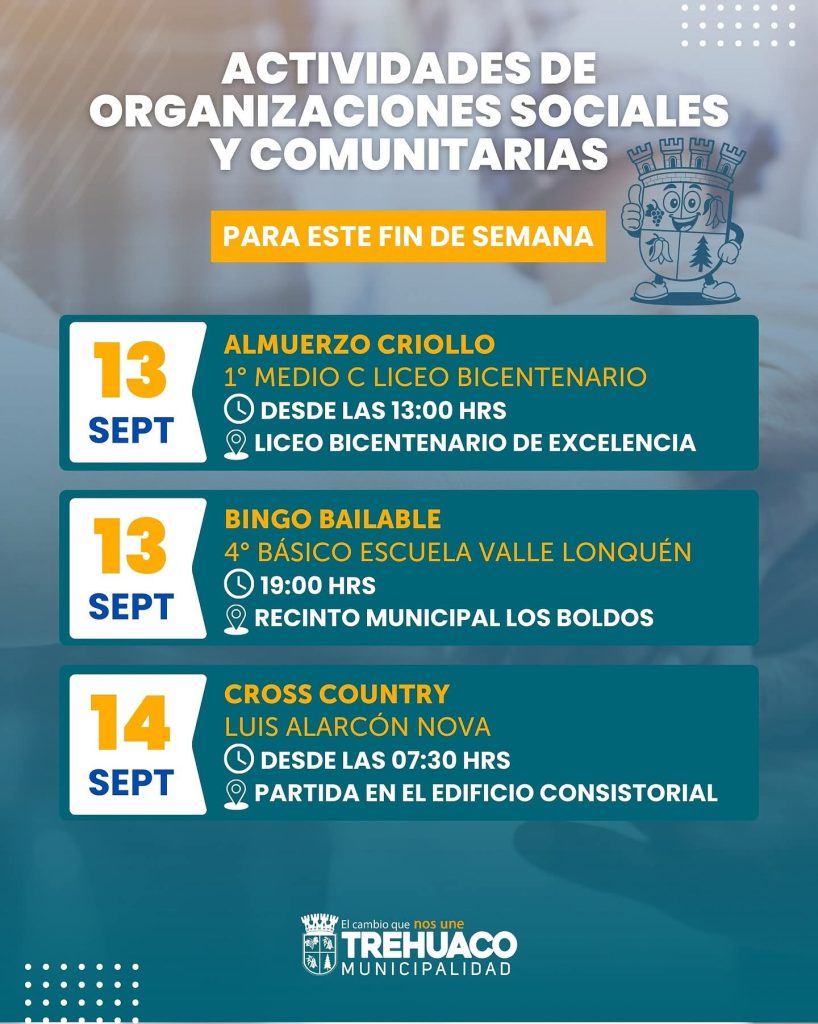 Este 13 y 14 de septiembre, la comuna de Trehuaco se llena de vida con actividades organizadas por sus establecimientos educacionales y el municipio. El sábado comienza con un almuerzo criollo en el Liceo Bicentenario y continúa con un bingo bailable en el recinto Los Boldos. El domingo, desde temprano, se realizará una competencia de cross country con partida en el Edificio Consistorial.