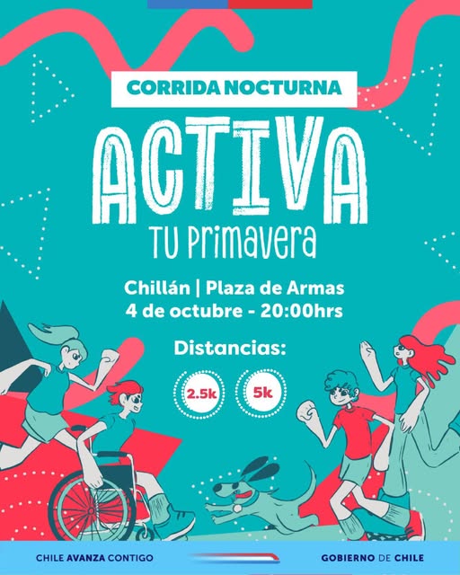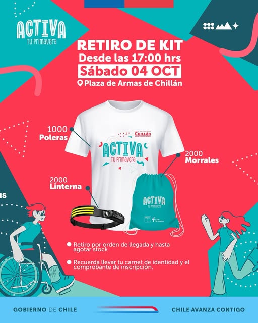 Si te inscribiste para la corrida nocturna #ActivaTuPrimavera de este sábado 4 de octubre, puedes retirar tu kit el mismo sábado desde las 17 horas en la Plaza de Armas de Chillán, donde será la largada a las 20 hrs. En caso de lluvia, se coordinará la entrega bajo techo en la entrada del Gobierno Regional de Ñuble.
