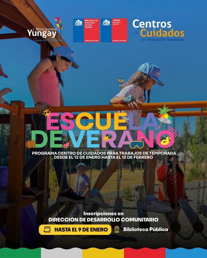 La Municipalidad de Yungay invita a las familias a participar en la Escuela de Verano 2026, un espacio de cuidado, recreación y aprendizaje destinado a niños y niñas de entre 6 y 12 años. El programa se desarrollará entre el 12 de enero y el 13 de febrero de 2026, ofreciendo actividades durante el período estival.